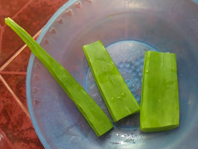 2. Now wash the Aloe vera leaf clean with a running tap water until the sap and the dirt are gone. After that, get rid of the thorns by slicing off the edges of the leaf with the knife. Then, cut the leaf into several parts and put them in a plate, as shown below.