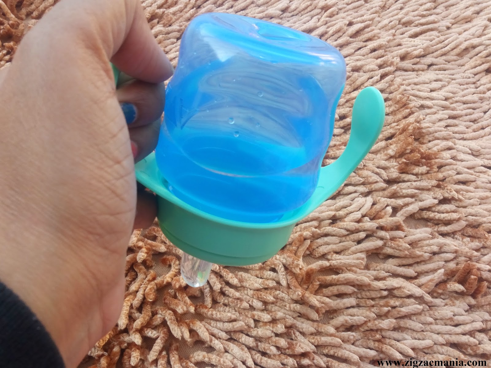 My opinion about this product: The spout cup has total 4 parts – a blue colored cup of size 200 ml, handles with integrated spout, valve and a snap-on hygienic cap. It is marked both in ml and fl-oz to help you know the exact amount of liquid that your child has drunk. These days I am giving water in it to my little munchkin, he can easily handle this cup with the help of handles.